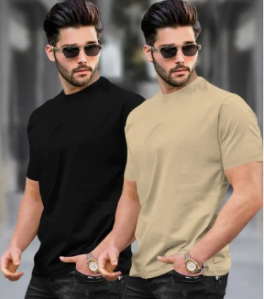 Two stylish men showcasing solid-color crew-neck T-shirts in black and beige. Paired with dark jeans, sunglasses, and wristwatches, the look highlights a clean, confident, and versatile style. Perfect for everyday wear, casual outings, or minimalist fashion lovers who prefer effortless sophistication.